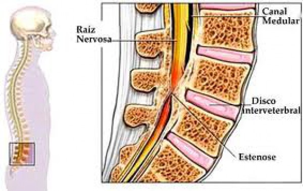 Dor lombar que pode irradiar até a região posterior de coxa. Dor com piora a hiperextensão da coluna e melhora a flexão da coluna.